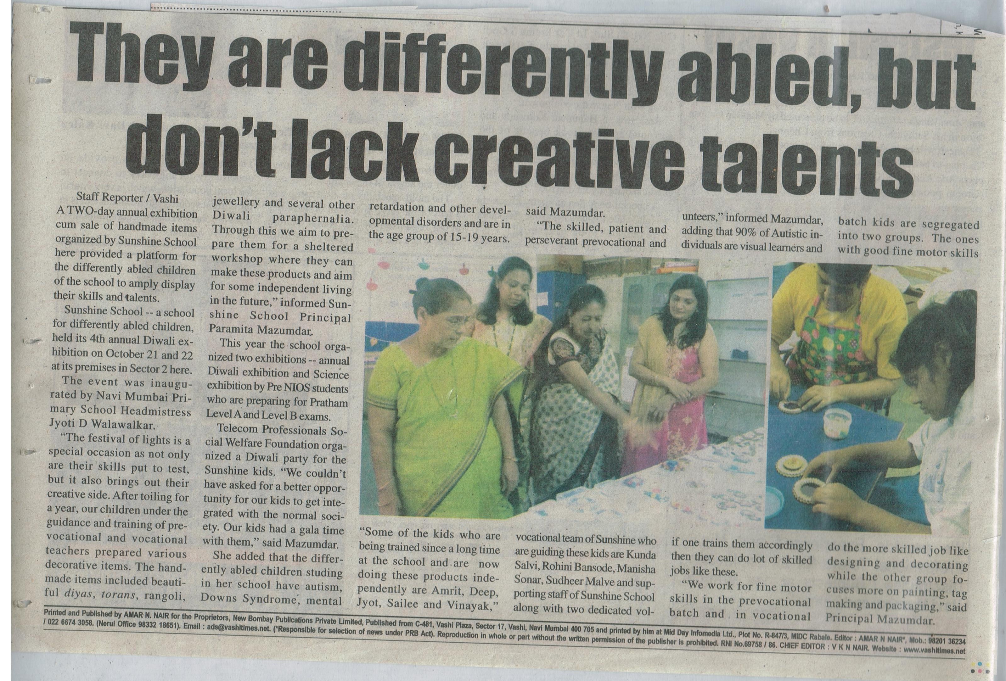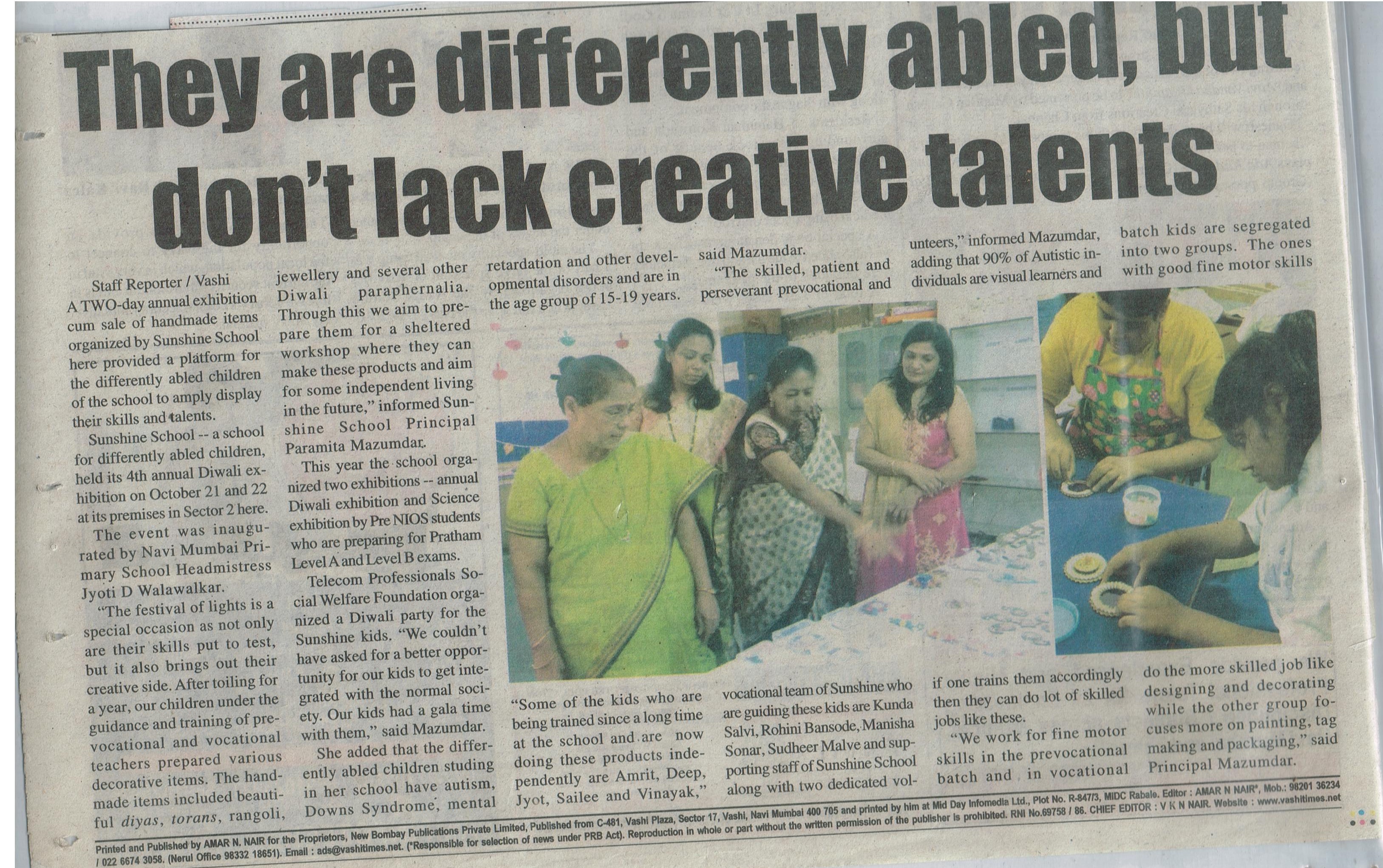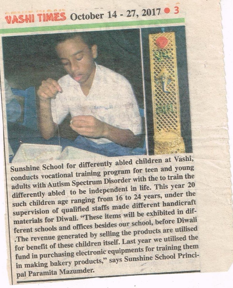 SUNSHINE SCHOOL WORKSHOP RH-4, M-9, SECTOR -6, VASHI, NAVI MUMBAI. 400703 Contact: 022-2782 7346